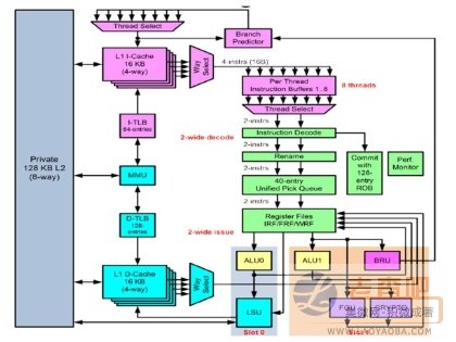 此次Hot Chips大会上,甲骨文也率先揭露了 T4 处理器的细节,这款 Niagara系列伺服器处理器的最新一代产品,采用了最新的乱序(out-of-order)双指令执行(dual-issue)核心。而且,尽管前一代T3 处理器采用16核心设计,而新一代T4仅有8核心,但工程师仍在T4中获得了惊人的五倍整数和七倍浮点效能提升。