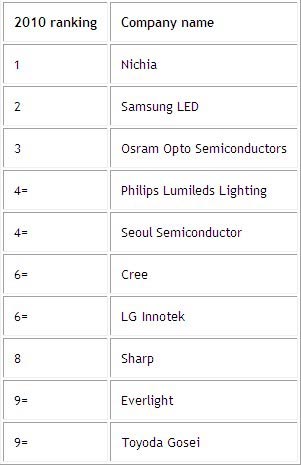 2010年LED前十大厂商排名: