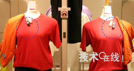 图1:比较服装面料的颜色是否会因照明发生改变。左侧为现有光源照明。把红色T恤衫和橙色T恤衫重叠,长时间照射,然后掀开橙色的T恤衫,可以发现,重叠位置和未重叠位置的红色有所区别(比较左右蓝色虚线内)。右侧为LED照明。当采用相同的步骤照射LED照明的光线后,红色未观察到变色。