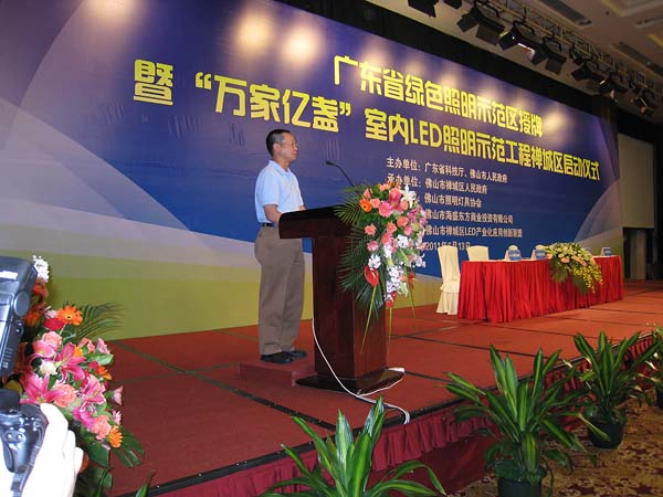 叶景图副厅长在仪式上发言指出,LED产业是我省三大战略性新兴产业之一,在LED路灯示范应用的拉动下,我省LED产业产值从09年的300亿上升到10年的800亿,取得了迅猛的发展。LED照明是照明领域的革命,代表了新兴产业的发展方向,因此必须要加大LED产品的推广应用力度,今年下半年将是实现任务目标的关键阶段,领导要抓协调,部门要抓落实。广东省“万家亿盏”室内LED绿色照明示范工程在禅城区率先启动,对全省LED产业的发展起到积极的带动作用。LED产业的发展离不开政府的带动和引导,省科技厅将会继续进行推动和支持,同时希望社会各界保持前期推广LED路灯的热情,继续大力开展室内LED照明工程的示范推广,促进我省LED产业的快速发展。