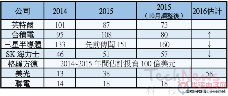 从半导体厂商对资本支出的缩减,也可看出 2015 年景气偏淡,英特尔原先即缩减 2015 年资本支出到 87 亿美元,10 月英特尔三度下修资本支出至 73 亿美元,原本估计今年会扩大投资到 105~110 亿美元的台积电,也跟进英特尔下调资本支出的脚步,最终资本支出调降到 80 亿美元。