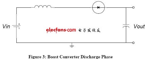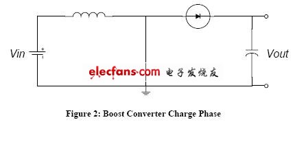 在充电过程中,开关闭合(三极管导通),等效电路如图二,开关(三极管)处用导线代替。这时,输入电压流过电感。二极管防止电容对地放电。由于输入是直流电,所以电感上的电流以一定的比率线性增加,这个比率跟电感大小有关。随着电感电流增加,电感里储存了一些能量。