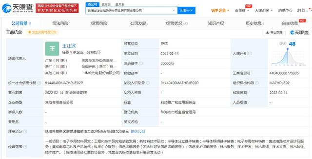 天眼查App显示,近日,珠海华发华灿先进半导体研究院有限公司成立,法定代表人为王江波,注册资本3亿,经营范围包括电子专用材料研发;半导体分立器件销售;集成电路芯片设计及服务等。股东信息显示,该公司由华灿光电股份有限公司、珠海华发实体产业研究院有限公司共同持股。