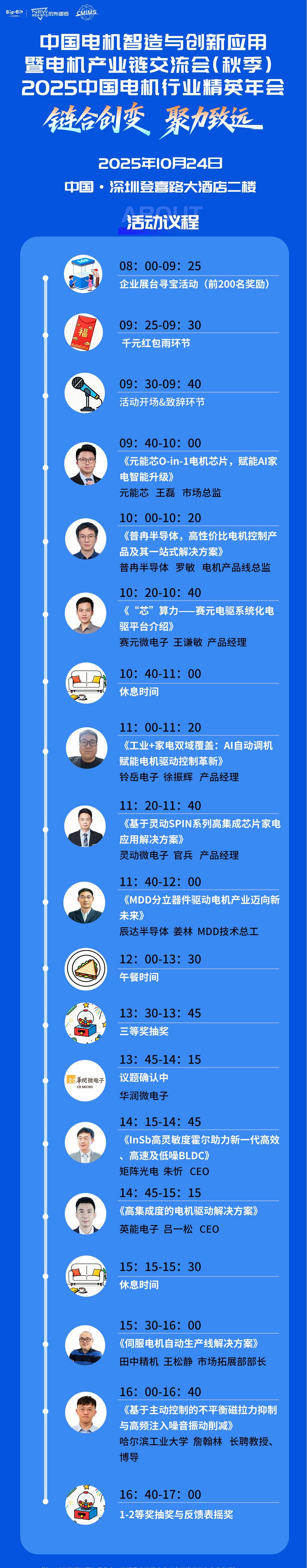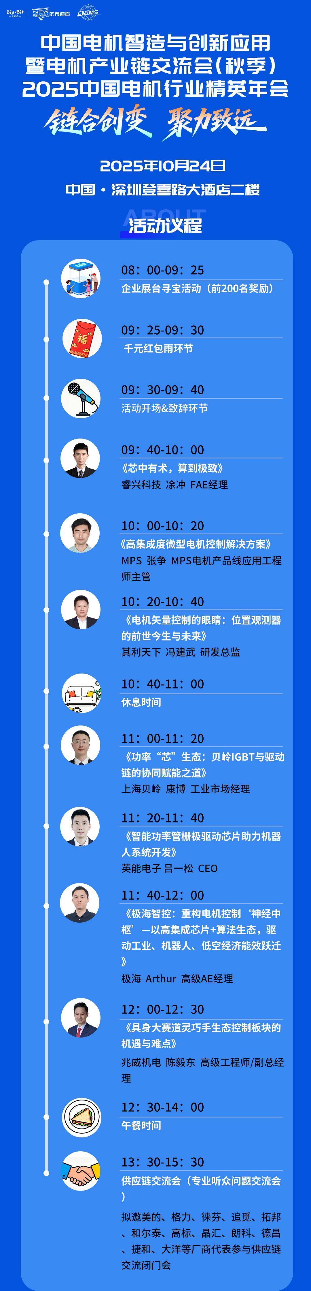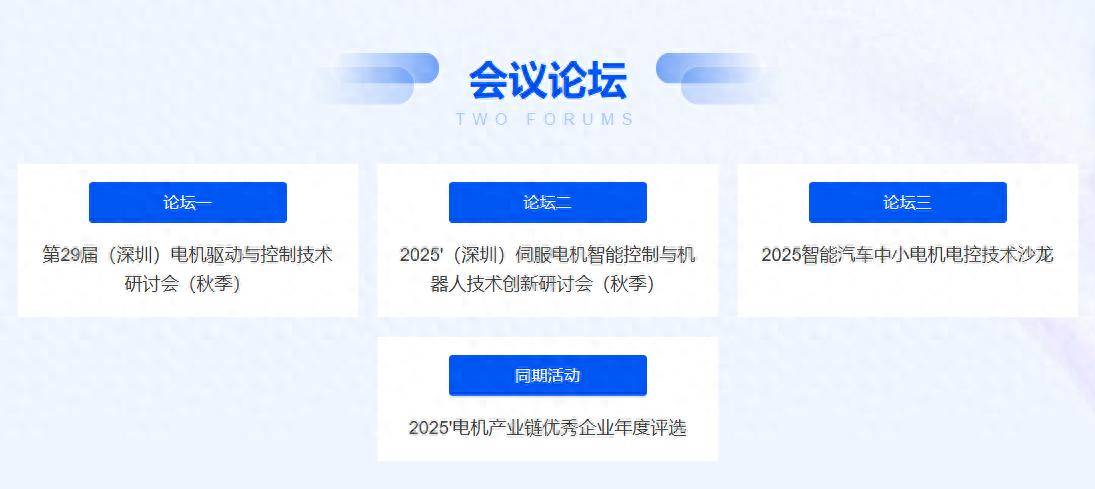 本次电机产业链交流会将设立第29届(深圳)电机驱动与控制技术研讨会、2025’(深圳)伺服电机智能控制与机器人技术创新研讨会、2025智能汽车电机电控与热管理技术沙龙三大专题论坛。