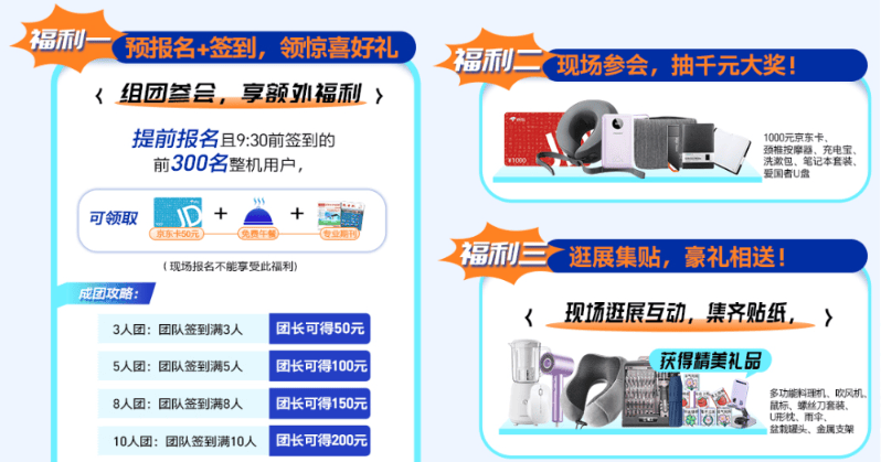 预报名+会议当天9点半前现场签到的前300名整机用户,可享加赠50元京东卡、免费午餐以及专业期刊的福利。组团参会,福利加倍!3人团,团队签到满3人,团长可得50元;10人团签到满10人,团长可得200元。