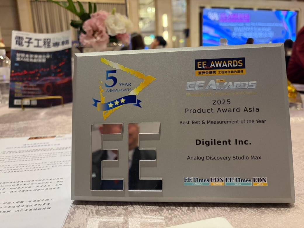 12月5日,Digilent 旗下重磅产品 Analog Discovery Studio Max 凭借卓越的性能表现与市场口碑,成功斩获 EE Awards 2025 亚洲年度最佳测试与测量产品大奖(Products Award Asia-Best Test & Measurement of the year)。