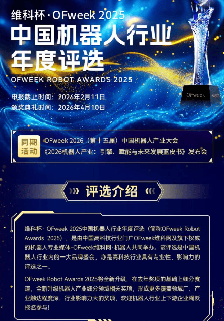 作为机器人行业年度标杆活动,维科杯·OFweek 2025中国机器人行业年度评选(简称:OFweek Robot Awards 2025)报名通道已正式开启。