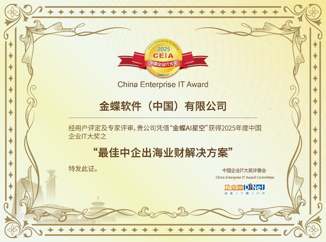 由政企市场专业媒体企业网D1net、信众智(CIO智力输出及社交平台)和中国企业数字化联盟联合主办的“2025 CEIA中国企业IT大奖”于2026年1月15日重磅揭晓。此次评选活动吸引了众多国内外知名企业的积极参与,包括戴尔科技集团、亚马逊云科技、IBM、联想集团、新华三、华为、阿里云、金蝶、浪潮信息等业界巨头。金蝶软件(中国)有限公司(以下简称“金蝶”)获评2025 CEIA中国企业IT大奖之“最佳中企出海业财解决方案”奖。